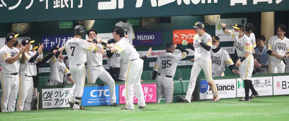 <ソ・ロ>5回1死三塁、中村晃の犠飛で先制し盛り上がるソフトバンクベンチ(撮影・岡田 丈靖)