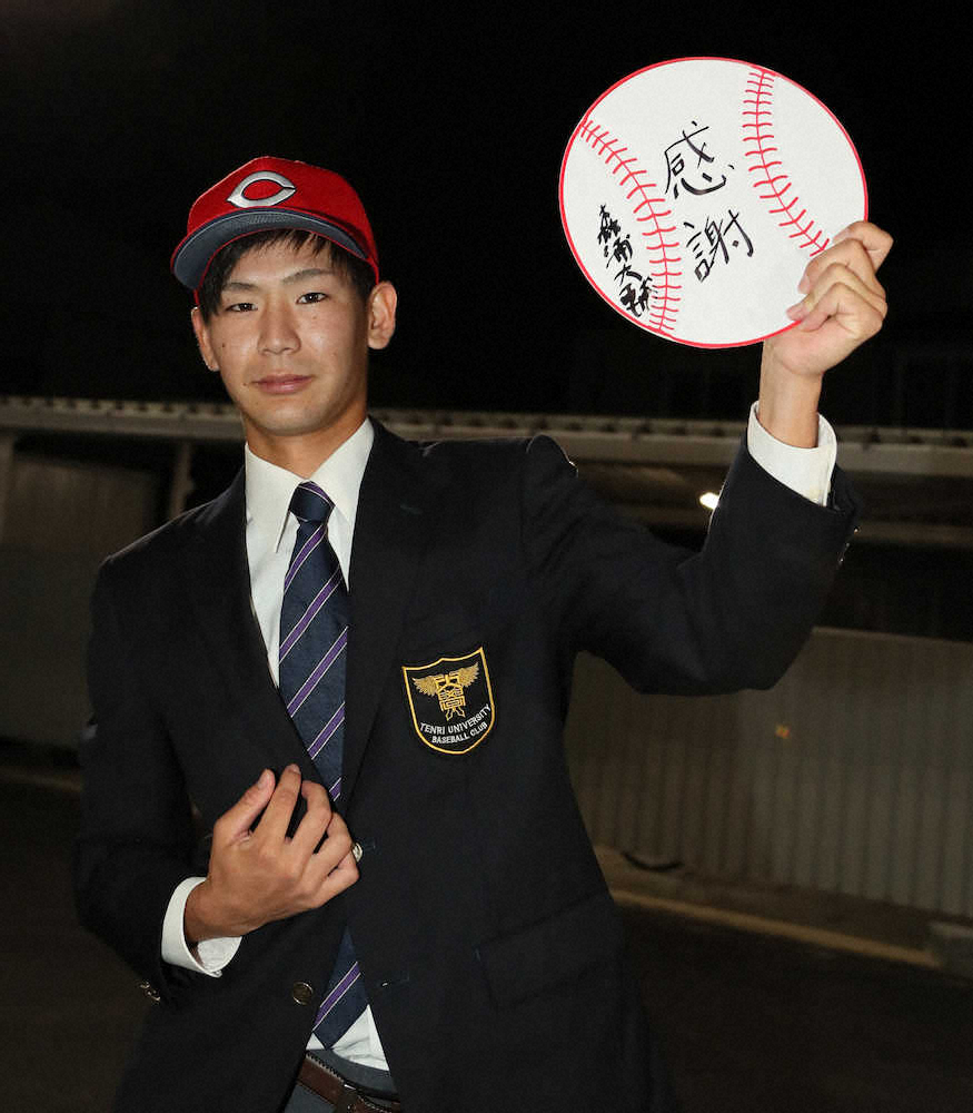 広島からの2位指名に、森浦(天理大)は驚き半分喜び半分の様子だった。天理市内の野球部寮の自室で、ドラフト中継で名前が挙がった瞬間を「ビックリしました」と振り返った。