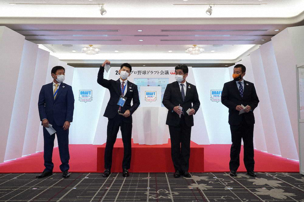 <プロ野球ドラフト会議>1位指名で近大・佐藤交渉権のくじを引き当てガッツポーズする阪神・矢野監督(左から2人目)。左からオリックス・福良GM、一人おいてソフトバンク・工藤監督、巨人・原監督(cNPB/BBM2020)