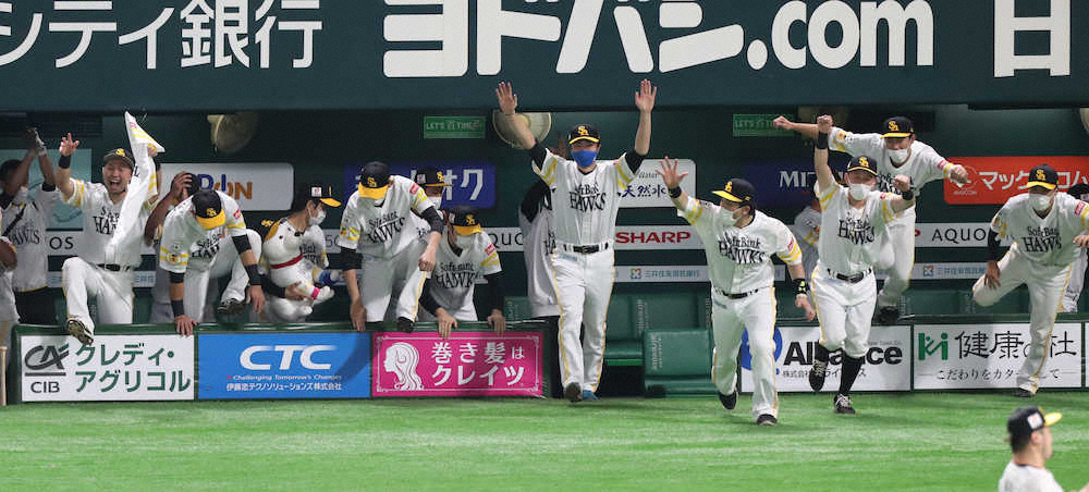 <ソ・ロ>リーグ優勝を決め、ベンチから飛び出す和田(右から5人目)らナイン(撮影・坂田 高浩)