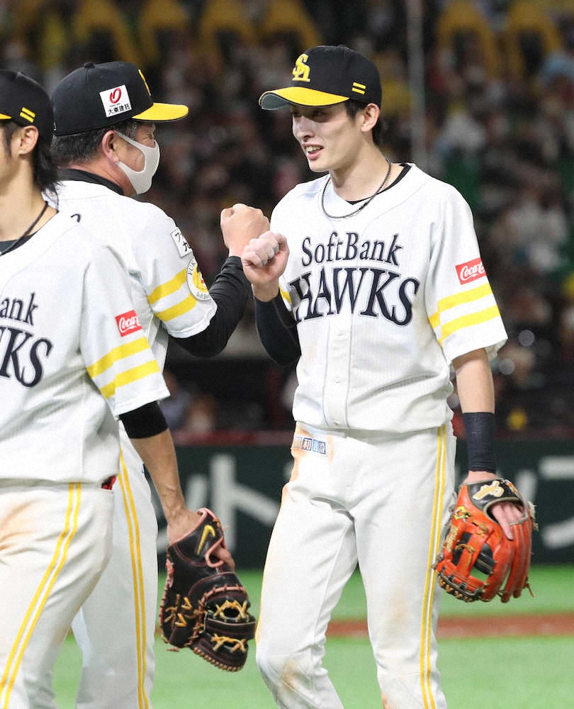ウイニングボールは、今季を象徴する男がさばいた。9回2死満塁。ロッテ・福田秀のゴロが、周東のもとへ転がった。笑みをたたえながら二塁を踏み、最後のアウトを完成させた。