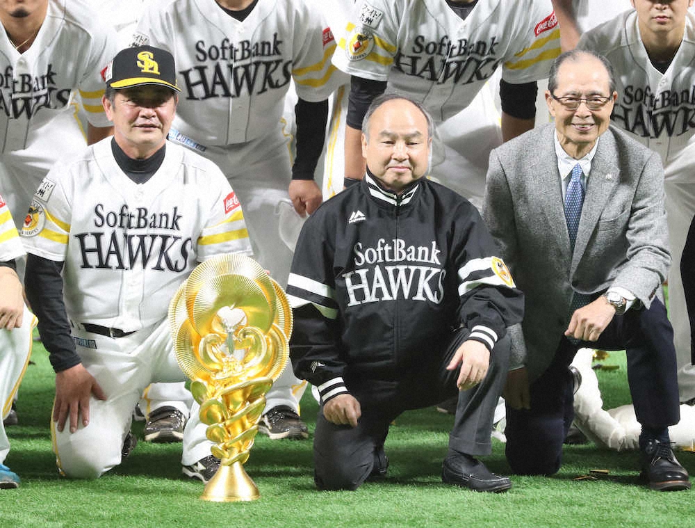 リーグVを決め、記念写真を撮る(左から)工藤監督、孫オーナー、王球団会長(撮影・中村 達也)