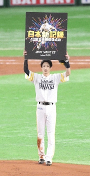 <ソ・ロ>初回1死一塁、打者・中村晃の時に一走・周東は二盗成功。12試合連続盗塁成功の日本記録を達成し記念ボードを掲げる(撮影・岡田 丈靖) Photo by スポニチ ソフトバンク・周東 12試合連続盗塁のプロ野球新記録!「世界の盗塁王」… ギャラリーで見る この記事のフォト 2020年10月29日の画像一覧 もっと見る 2020年10月29日の画像をもっと見る