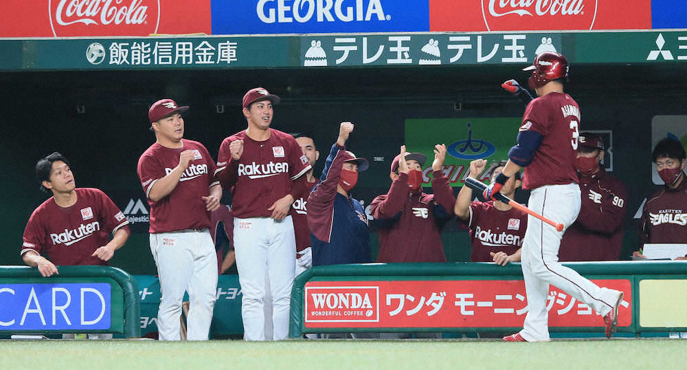 <西・楽>8回無死、ソロ本塁打を放った浅村(右)はチームメートに出迎えられる(撮影・尾崎 有希)