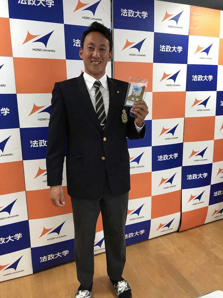ドラフト会議で楽天から2位で指名された法大・高田孝一投手(22)が29日、神奈川県内の法大野球部合宿所で球団の指名あいさつを受けた。1メートル83、91キロの恵まれた体格から最速156キロの直球を投げ込むパワー系右腕で「持ち味はストレート。先発でもリリーフでも、いろいろな場面で投げられる。将来的には、球団やファンのみなさんに信頼される投手になりたい」と抱負を語った。