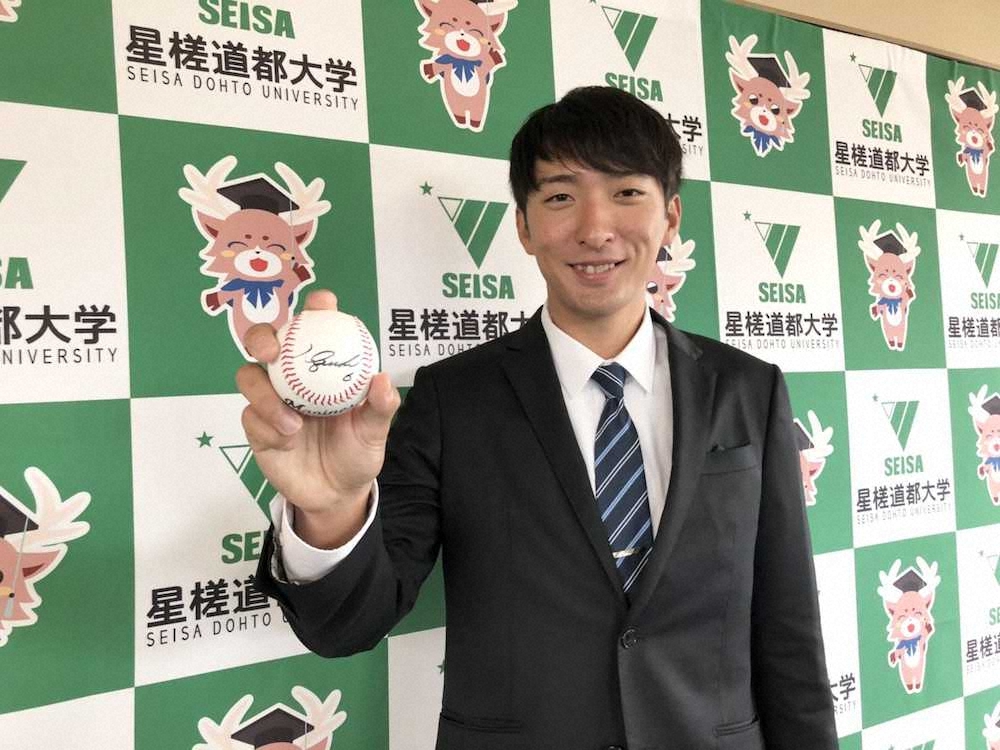 ロッテからドラフト4位で指名された星槎道都大・河村説人投手(4年)が同校で永野吉成スカウト部長、榎康弘チーフスカウト、柳沼強担当スカウトから指名あいさつを受けた。