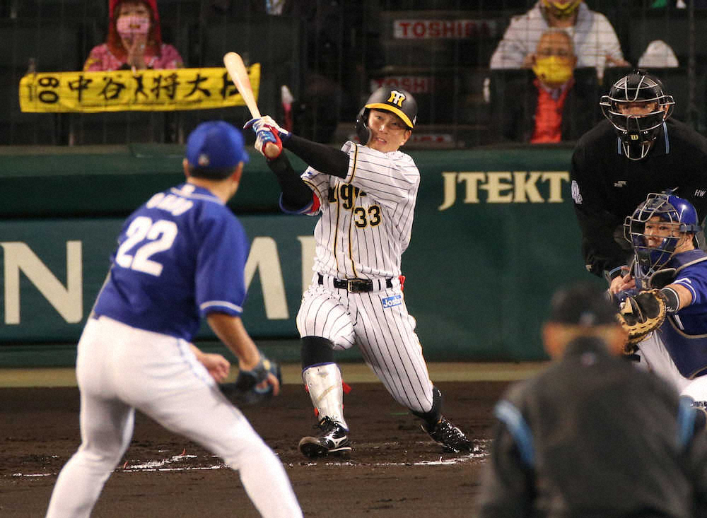 西勇が1点を先制された直後の初回、対峙(たいじ)したのは45回連続無失点と無双状態の大野雄。右前打の近本を一塁に置き、送りバントではなく強攻策を選択したベンチの期待にフルスイングで応えた。7球目のフォークを捉えた打球は右中間を破る適時二塁打。大野雄に対しては7月24日の対戦で4回に1点を奪って以来、20イニングぶりの得点となる会心の同点打で記録を止めると、走塁でも躍動した。マルテの遊撃左へのゴロ(記録は内野安打)で三塁を陥れると、大山の遊ゴロの間に勝ち越しのホームを踏んだ。