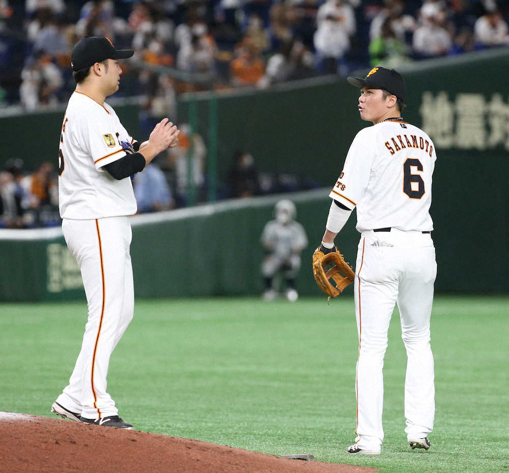 <巨・ヤ>5回、同点タイムリーを浴びた今村(左)に気合いを入れる坂本 (撮影・森沢裕)