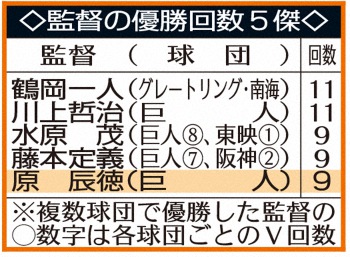 マジック1としていた巨人は30日、延長10回の末、ヤクルトと3―3で引き分け、2位・阪神がDeNAと引き分けたため、2年連続38度目(1リーグ時代を含め47度目)の優勝を決めた。引き分けVは球団史上初。原辰徳監督(62)は歴代3位タイの9度目のリーグ制覇となった。セ・リーグはクライマックスシリーズ(CS)がなく、11月21日から始まる日本シリーズではCSを勝ち抜いたパの球団と対戦し、12年以来8年ぶりの日本一奪回を目指す。