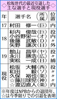 1980年度生まれの「松坂世代」の現役プロ野球選手は今季限りで現役引退を表明した阪神・藤川、楽天・渡辺直を含め5選手。