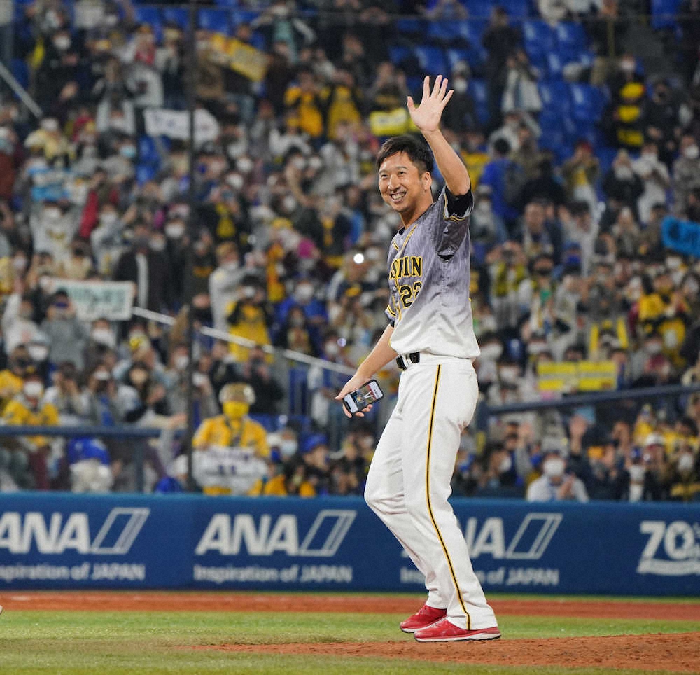 《最後の横浜で大和と抱擁》現役最後となる横浜での試合だったが、藤川に登板機会はなかった。DeNAの勝利セレモニー終了後、場内におなじみの登場曲が流れ、三塁ベンチから登場。左翼へ足を運びビジターの虎党に深々と頭を下げると右翼にも行きDeNAファンにも手を振った。一塁ベンチ前ではかつての同僚で31日の対戦で2ランを浴びた大和と笑顔で抱擁。「感謝しかない。(大和は)一緒にやってきた仲間だしユニホーム脱げば12球団の選手は仲間。そういうふうな姿をファンに見せられたのは価値があるのかな」としみじみと話した。あす3日から甲子園3連戦。「試合に集中して。その中で藤川球児の最後を一緒に楽しめたら」と表情を引き締めた。