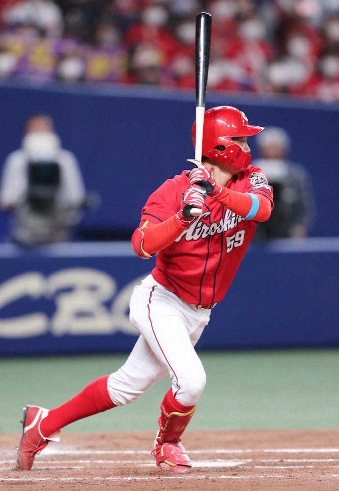 広島・大盛が先制点をたたき出した。2回1死満塁から鮮やかな中前適時打。初回の先頭打者で空振り三振した柳の内角カットボールを、うまくはじき返した。