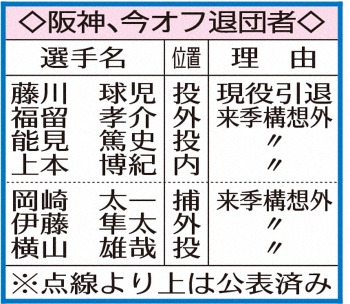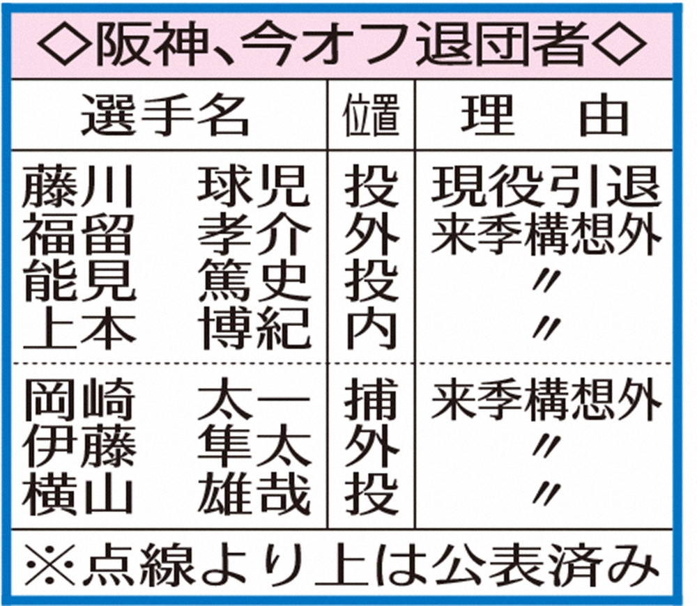 阪神の(左から)岡崎、伊藤隼、横山 Photo by スポニチ 阪神 伊藤隼戦力外!嵐のオフ…横山、岡崎と“かつてのドラ1”3人にも非情通告 ギャラリーで見る この記事のフォト 2020年11月04日の画像一覧 もっと見る 2020年11月04日の画像をもっと見る