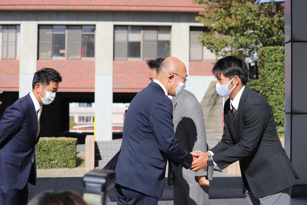 阪神から育成ドラフト1位で指名された九産大の岩田将貴投手(22)が4日、福岡市内の同大で、畑山俊二統括スカウト、担当の田中秀太スカウトから指名あいさつを受けた。