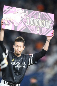 ○…千賀(ソ)が4日ロッテ戦の3回に荻野から三振を奪い、通算1000奪三振を達成した。プロ野球151人目。初奪三振は12年4月30日ロッテ戦で里崎から。通算855回1/3での達成は、17年藤川(神)の771回2/3に次ぐ歴代2位。パでは93年野茂(近鉄)の871回を抜くスピード到達になった。