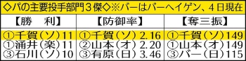 ○…千賀(ソ)が8回無失点でハーラートップタイの11勝目。シーズン規定投球回にも到達し防御率1位の2.16で顔を出した。奪三振も149で山本(オ)と並ぶリーグ最多タイ。防御率、最多勝、最多奪三振の3冠は最近では18年菅野(巨)が記録しているが、パでは06年斉藤和巳(ソ)が最後。千賀が手にすればリーグ14年ぶりだ。また、千賀は17年最高勝率、19年最多奪三振を獲得。同一シーズンに複数タイトルなら自身初めてになる。