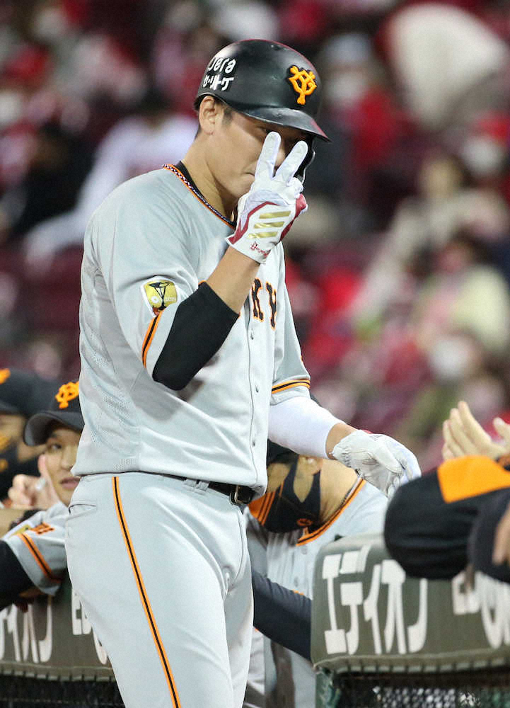 <広・巨>7回2死一塁、岡本の二塁打で生還した坂本は、「あと2」?と指で示しながらベンチに戻る (撮影・森沢裕)