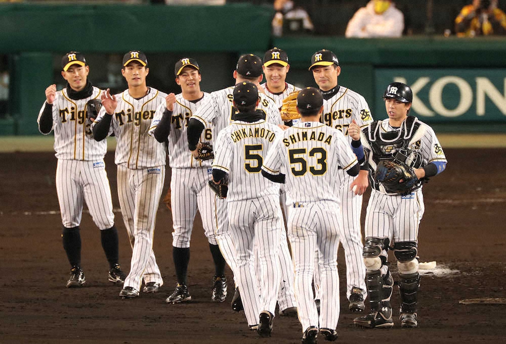 <神・ヤ24>9回を締め、ナインと喜びを分かち合う岩崎(右から2人目)(撮影・坂田 高浩)