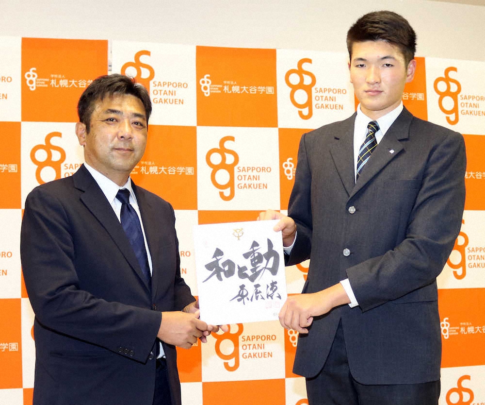 札幌大谷の阿部(右)は巨人の柏田スカウトから原監督の色紙を受け取る(撮影・石川加奈子)