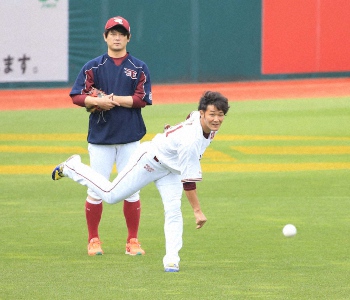 <楽・西24>キャッチボールする楽天・久保 (撮影・白鳥 佳樹)