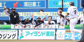 <ロ・西>3回2死一、二塁、菅野の左前適時安打で生還した安田(右端)を出迎えるロッテナイン(撮影・西川祐介) Photo by スポニチ 勝てばCSのロッテ反撃開始!3回に相手失策&菅野の適時打で2点差追いつく ギャラリーで見る この記事のフォト 2020年11月08日の画像一覧 もっと見る 2020年11月08日の画像をもっと見る