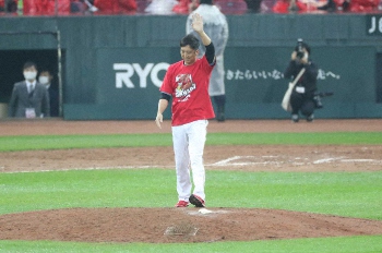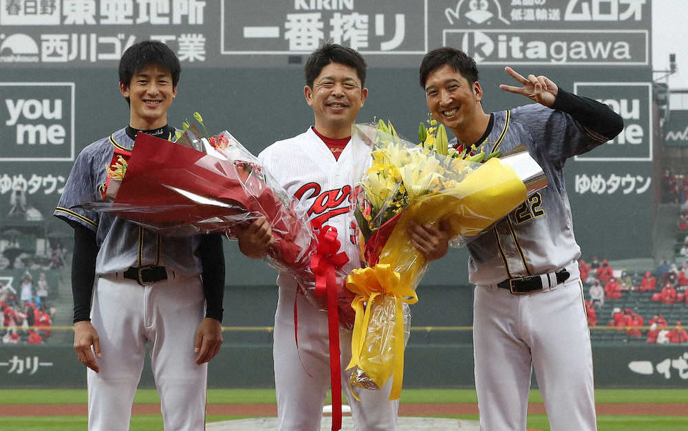 そして、サプライズも…。この日は石原慶の引退試合で、広島ナインが作成し試合前練習で全員が着用した石原慶がプリントされた引退記念Tシャツをポケットから取り出すや、広島ナインの前で着込んでマウンドへ。記念撮影もしてはしゃいだ。その後に行われるスピーチの“前座”を務めてみせた。