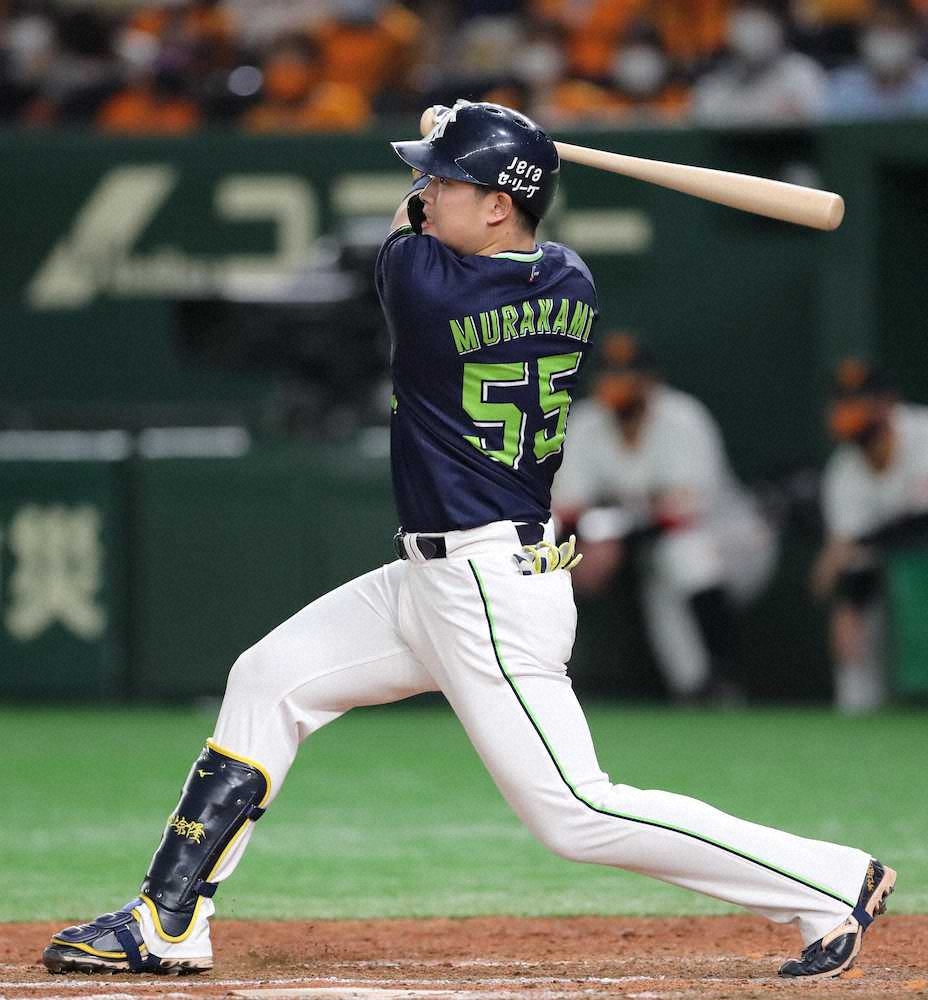 <巨・ヤ>9回、2打席連続のソロ本塁打を放つ村上(撮影・村上 大輔)
