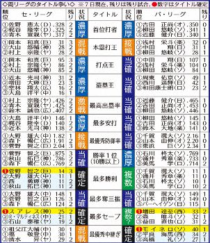 タイトル争いでは、初の本塁打王を狙う楽天・浅村がリーグトップの32本塁打。1試合を残す日本ハム・中田に1本差をつけてシーズンを終え「一番縁がないと思っていたホームランでタイトルを争えて、自分を褒めてあげたい」と話した。
