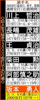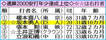右打者最速の勲章を手にした。巨人・坂本勇人内野手(31)が8日、ヤクルト戦の初回に左翼線二塁打を放ち、史上53人目、右打者史上最年少の31歳10カ月で2000安打を達成した。3回にはバックスクリーンへ2ラン、4回には遊撃内野安打も放った。2000安打達成試合で猛打賞は、球団では56年の川上哲治以来64年ぶり2人目。NPB史上2人目の3000安打へ、あくまで通過点の猛打だった。