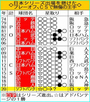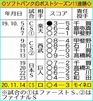 ソフトバンクのポストシーズン11連勝 Photo by スポニチ ソフトバンク ポストシーズン11連勝 無傷の王手で突破率100%! ギャラリーで見る この記事のフォト 2020年11月15日の画像一覧 もっと見る 2020年11月15日の画像をもっと見る