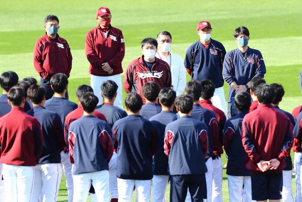 練習前、ナインを前に訓示する楽天の石井新監督(中央)(撮影・会津 智海)