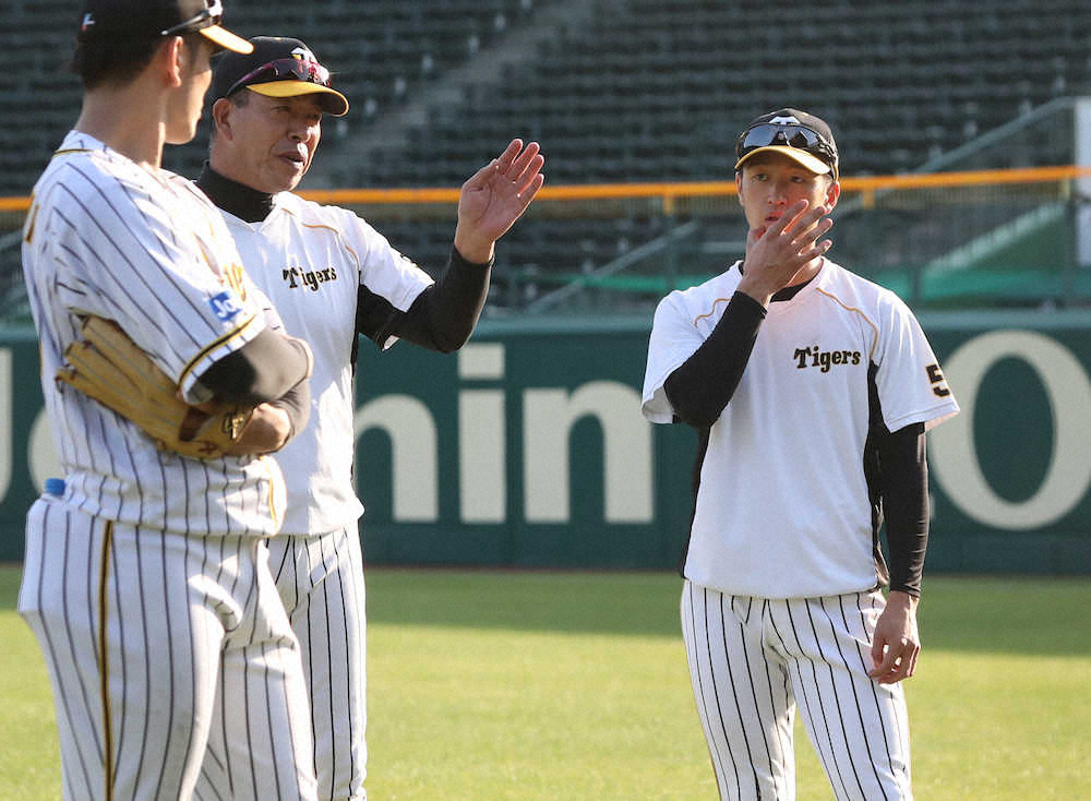 <阪神秋季練習>井上ヘッドコーチ(左から2人目)の話に耳を傾ける近本(右)(撮影・北條 貴史)