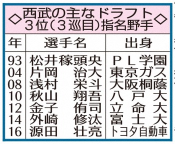 高校通算49発のスラッガーは「目標は3冠王。(元ソフトバンクで04年3冠王の)松中さんのようになりたい。YouTubeで同じ左打者の松中さんの映像を見てます」と夢を掲げた。球団では08年から浅村(現楽天)、秋山(現レッズ)、金子、外崎、源田と偶数年のドラフト3位野手は主力へと成長。松井2軍監督も93年の3位入団だった。潮崎哲也編成グループディレクターも「将来はリーグを代表する選手になれる」と期待した。