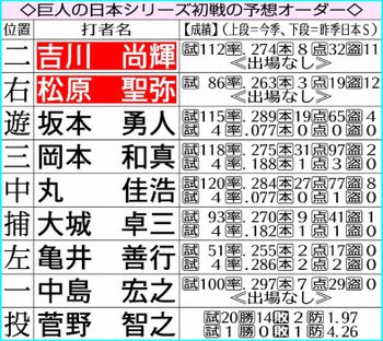 日本シリーズ巨人初戦の予想オーダー Photo by スポニチ 巨人・原監督 「ナオマツ」に日本シリーズ1、2番託す!「十分戦えるだけ… ギャラリーで見る この記事のフォト 2020年11月19日の画像一覧 もっと見る 2020年11月19日の画像をもっと見る