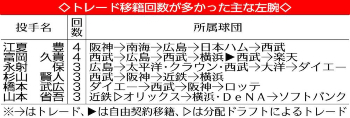 左腕は昔も今も各球団にとって貴重な存在で何度もトレードされる投手が少なくない。206勝193セーブで優勝請負人といわれた江夏豊は阪神を皮切りに4度もトレード。94年ドラフト1位で西武に入団した富岡久貴も4度、救援左腕として重宝された永射保、杉山賢人、橋本武広は3度トレードされた。なお、多数の球団に所属した投手として有名なのが左腕の後藤修。磐田南高から52年プロ入りすると12年の間に巨人など8球団に所属したが、トレードは1度だけで、ほとんどが自由契約による移籍だった。