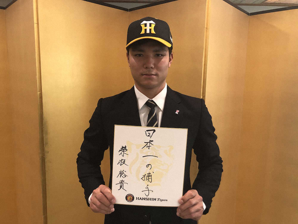 阪神からドラフト4位指名された立命大・栄枝裕貴捕手(22)が22日、京都市内のホテルで入団交渉し契約金5000万円、年俸800万円(金額は推定)で仮契約。自慢の強肩が名字から連想される「枝キャノン」と呼ばれていることを明かし、即戦力捕手として「梅ちゃんバズーカ」を持つ正妻・梅野超えを目指す決意を示した。