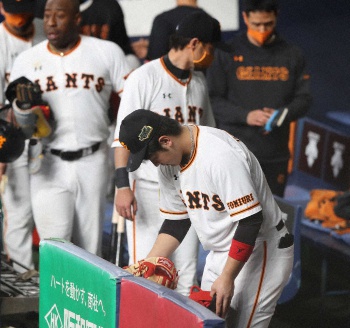 <巨・ソ>2連敗を喫し、肩を落としてベンチを去る岡本(右端)ら巨人ナイン(撮影・大森 寛明)