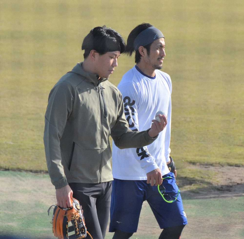 キャッチボール後に会話をする大野雄(左)と祖父江