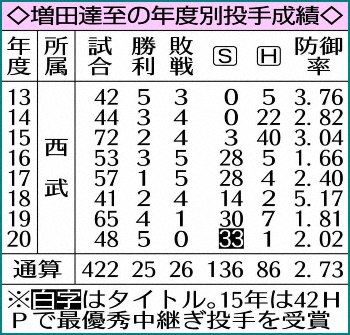 ◆増田 達至(ますだ・たつし)1988年(昭63)4月23日生まれ、兵庫県洲本市出身の32歳。柳学園から福井工大、NTT西日本を経て12年ドラフト1位で西武入団。15年に42ホールドポイントを挙げ、最優秀中継ぎ投手に輝いた。16年からは抑えを任され、今季は33セーブで自身初の最多セーブを獲得。1メートル80、88キロ。右投げ右打ち。