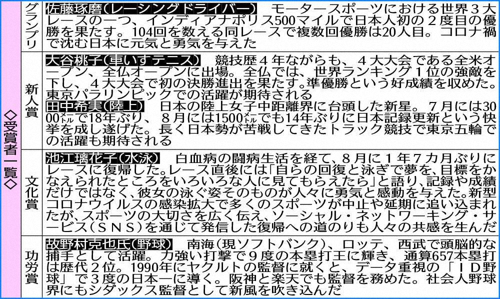 <2020毎日スポーツ人賞表彰式>人見絹枝ブロンズ像を持つ(左から)新人賞の大谷桃子、グランプリの佐藤琢磨、功労賞の故・野村克也氏の息子の野村克則氏(撮影・篠原岳夫) Photo by スポニチ 野村克則氏 父・克也氏の「毎日スポーツ人賞」功労賞受賞に形見身に着け… ギャラリーで見る この記事のフォト 2020年12月05日の画像一覧 もっと見る 2020年12月05日の画像をもっと見る