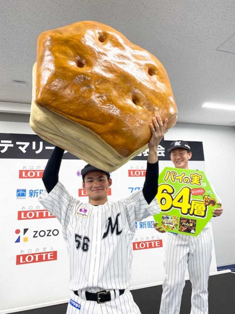 ロッテは新人9選手がさいたま市内にて新入団会見を行い、会見後に司会で場内アナウンス担当30年目のシーズンを終えた谷保恵美さんからロッテの人気商品「パイの実」に関して次のような紹介が送られた。