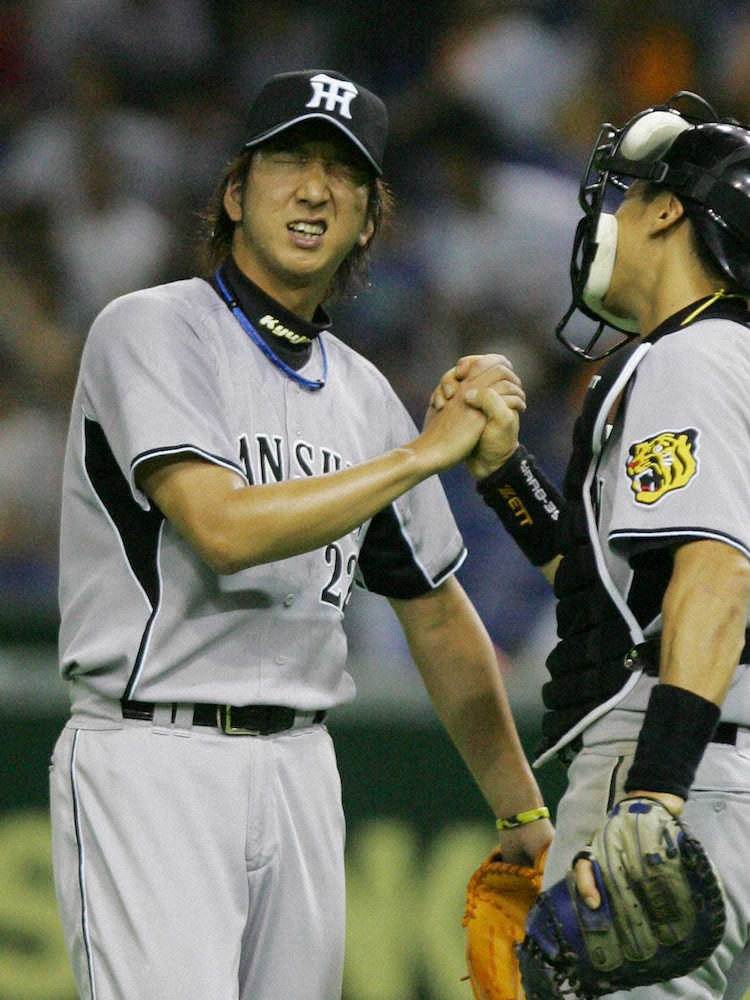 07年9月9日、巨人戦で最後を抑え疲れ切った表情で矢野(右)と握手を交わす藤川
