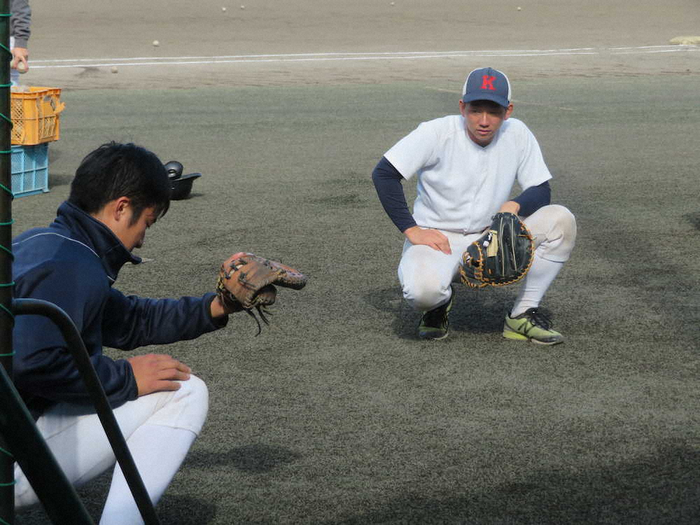 後輩の捕手にキャッチング始動する慶大・福井主将(右)