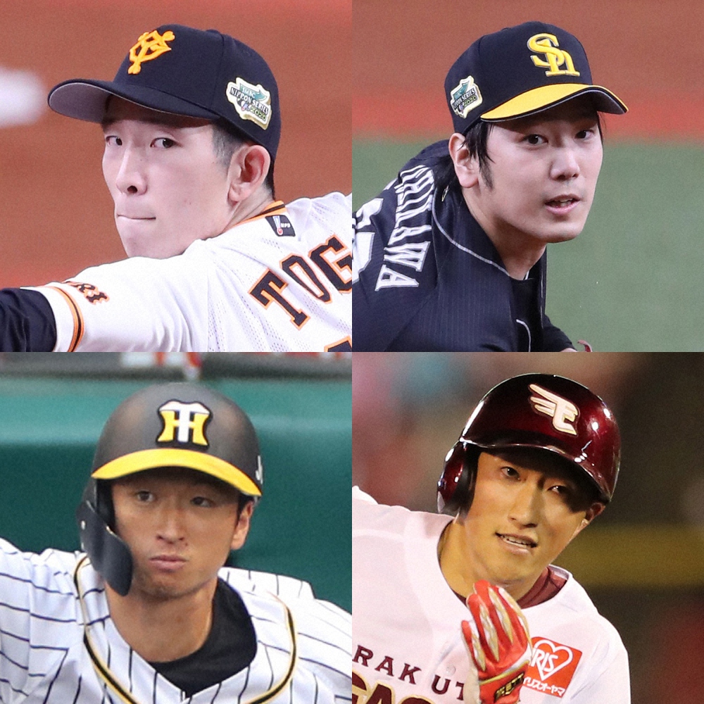 (左上から時計回りに)巨人・戸郷翔征投手、ソフトバンク・石川柊太投手、楽天・小深田大翔内野手、阪神・近本光司外野手
