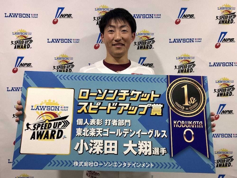 楽天の小深田が自慢の俊足以外でもスピードを評価された。無走者時に相手投手の平均投球間隔が最も短かった打者を表彰する、スピードアップ賞を初受賞。「1年目からこのような賞を頂けてうれしい」と喜んだ。