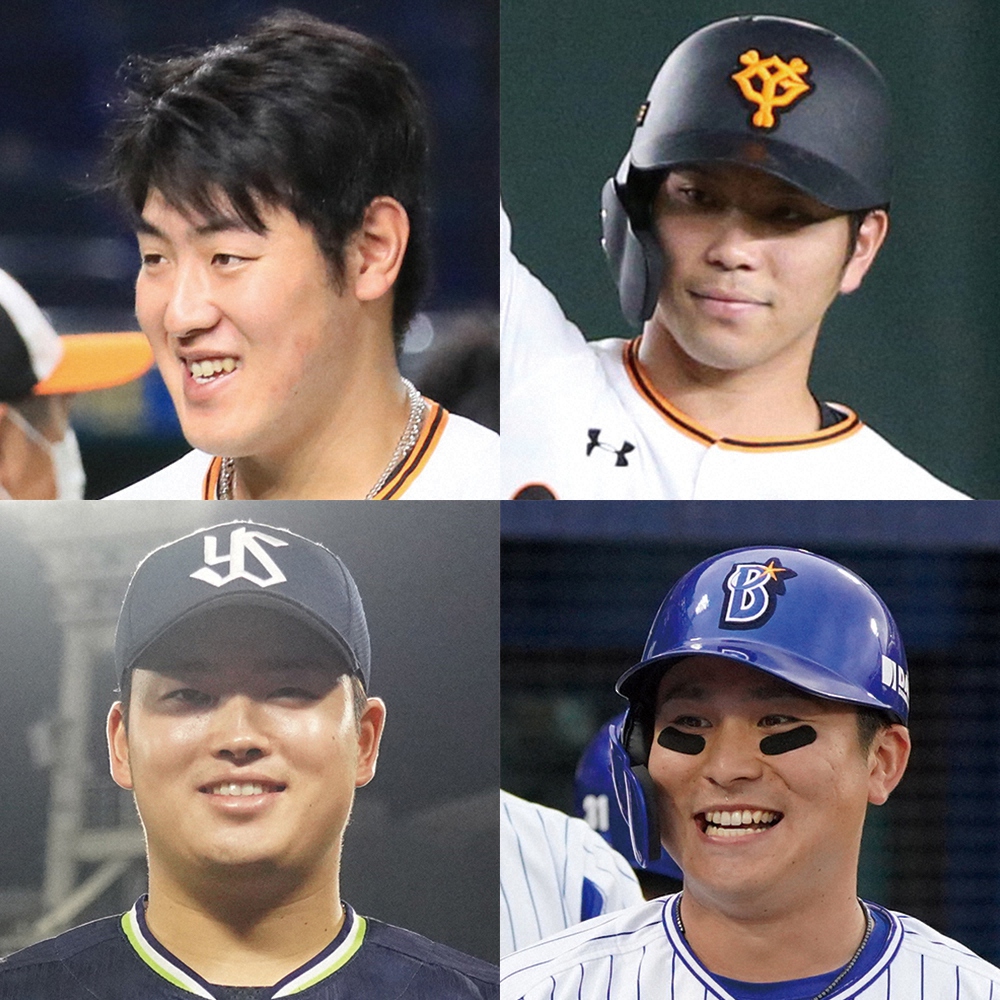 (左上から時計回りに)巨人・岡本、巨人・大城、DeNA・佐野、ヤクルト・村上