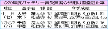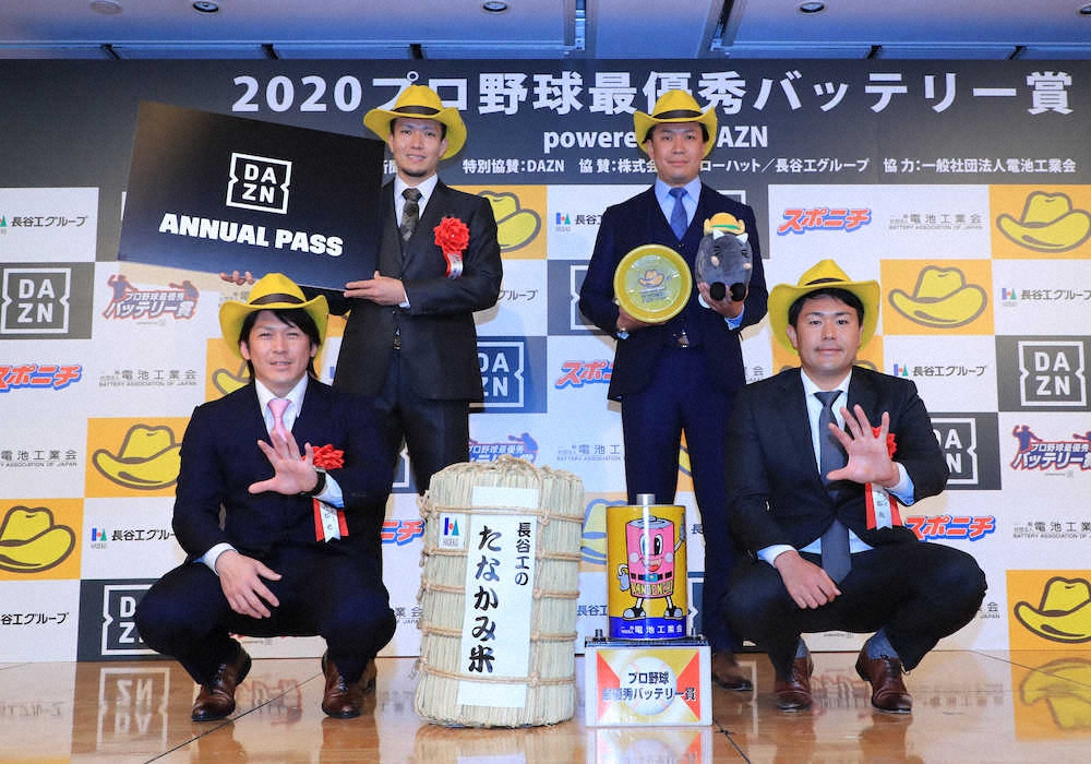 ▽最優秀バッテリー賞 投手だけでなく捕手にもスポットを当て、球界最高の「バッテリー」を表彰するもの。第1回は1991年で今年は節目の30回目。スポニチ野球評論家による選考委員会で決定。投手はローテーションの一員として、または救援投手としてシーズンを通して活躍したことを最低条件とする。捕手はインサイドワークや盗塁阻止率、捕逸の少なさなどが基準となる。今季はDAZNが特別協賛となり「月間賞」を新設。DAZN公式ツイッターによるファン投票も両バッテリーが1位の支持を集めた。