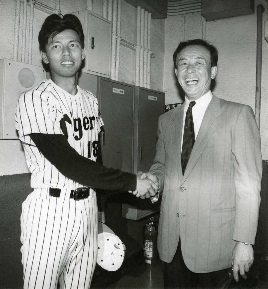 新宮高、阪神の後輩、新人の藪を激励する井崎(旧姓・前岡)勤也さん(1994年5月24日、甲子園球場)