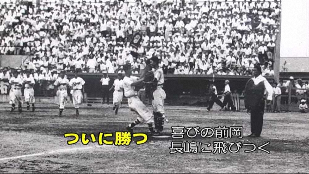 和歌山大会優勝を決め、捕手に抱きつく新宮高・前岡勤也投手。スタンドは超満員(1954年7月30日、和歌山県営向ノ芝球場)=DVD『栄光は永久に』(新宮高校硬式野球部OB会有志)より=