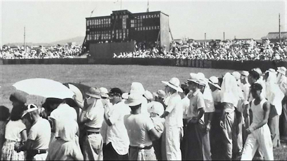 和歌山大会優勝を決め、場内を行進する新宮高の選手たち(1954年7月30日、和歌山県営向ノ芝球場)=DVD『栄光は永久に』(新宮高校硬式野球部OB会有志)より=